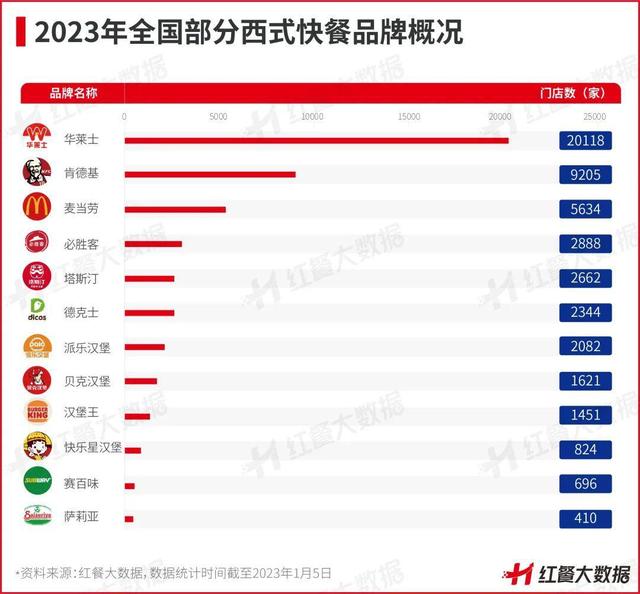 據(jù)紅餐大數(shù)據(jù),截至2023年1月5日,華萊士門店總數(shù)已超過了20000家;肯德基、麥當(dāng)勞則分別以9200余家、5600余家門店跟隨其后;必勝客、塔斯汀、德克士、派樂漢堡等品牌均已超過2000家門店。