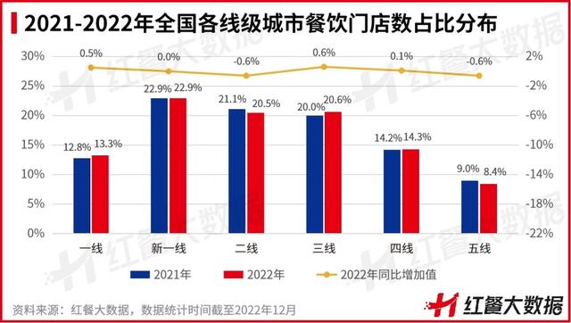 據(jù)紅餐大數(shù)據(jù),2022年一線、三線、四線城市連鎖餐飲門店數(shù)的占比相較2021年均有所上升,其中一線城市占比是13.3%,較上年增長0.5個(gè)百分點(diǎn);三線城市為20.6%,較上年增長0.6個(gè)百分點(diǎn);四線城市占比是14.3%,較上年增長0.1個(gè)百分點(diǎn);新一線城市的連鎖餐飲門店數(shù)占比較上年持平,為22.9%;而二線、五線城市占比略有收縮,分別為20.5%和8.4%,均較上年縮減0.6個(gè)百分點(diǎn)。