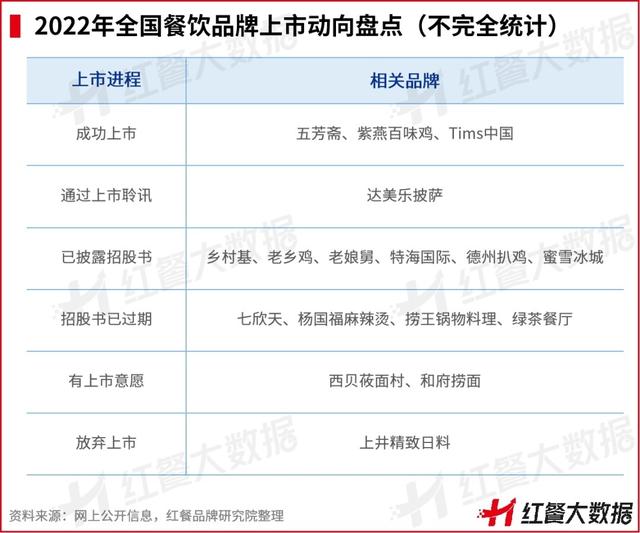 此外,2022年不少餐飲頭部品牌傳出沖擊IPO的消息。據(jù)紅餐品牌研究院統(tǒng)計(jì),截至2022年12月,本年度共有17家餐飲企業(yè)傳出上市相關(guān)動態(tài)。隨著五芳齋、紫燕百味雞和Tims中國相繼在今年8月、9月成功上市,鄉(xiāng)村基、老鄉(xiāng)雞、老娘舅爭奪“中式米飯快餐第一股”,餐飲行業(yè)迎來了上市熱潮。