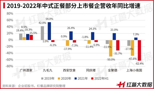 在2019年之前,中式正餐已出現(xiàn)增長乏力的苗頭。而近年來,在疫情的沖擊之下,中式正餐更是發(fā)展得步履蹣跚。從上市中式正餐企業(yè)看,除了少數(shù)餐企(如業(yè)務(wù)重心轉(zhuǎn)移至食品板塊的廣州酒家、通過副牌發(fā)力多個(gè)品類的九毛九等)較為成功地找到企業(yè)第二增長曲線外,其余上市餐企的營收增幅都不太樂觀。